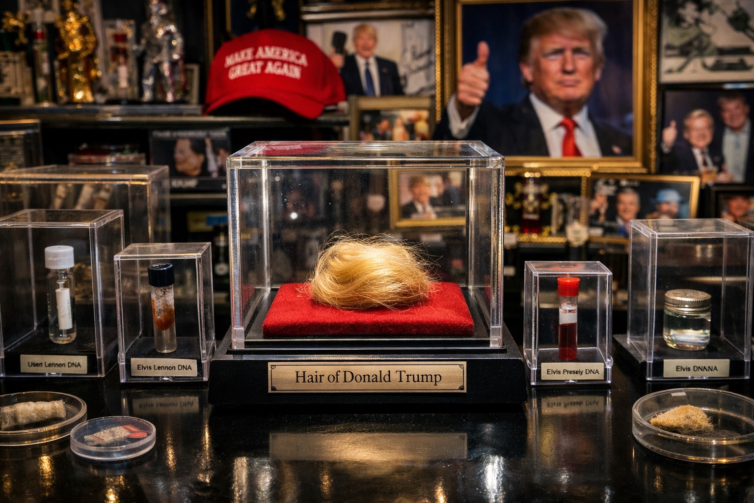 「ああ、これはドナルド・トランプの髪の毛です」とゲラー氏は“防弾ガラス製”の容器を指さしながら言った。