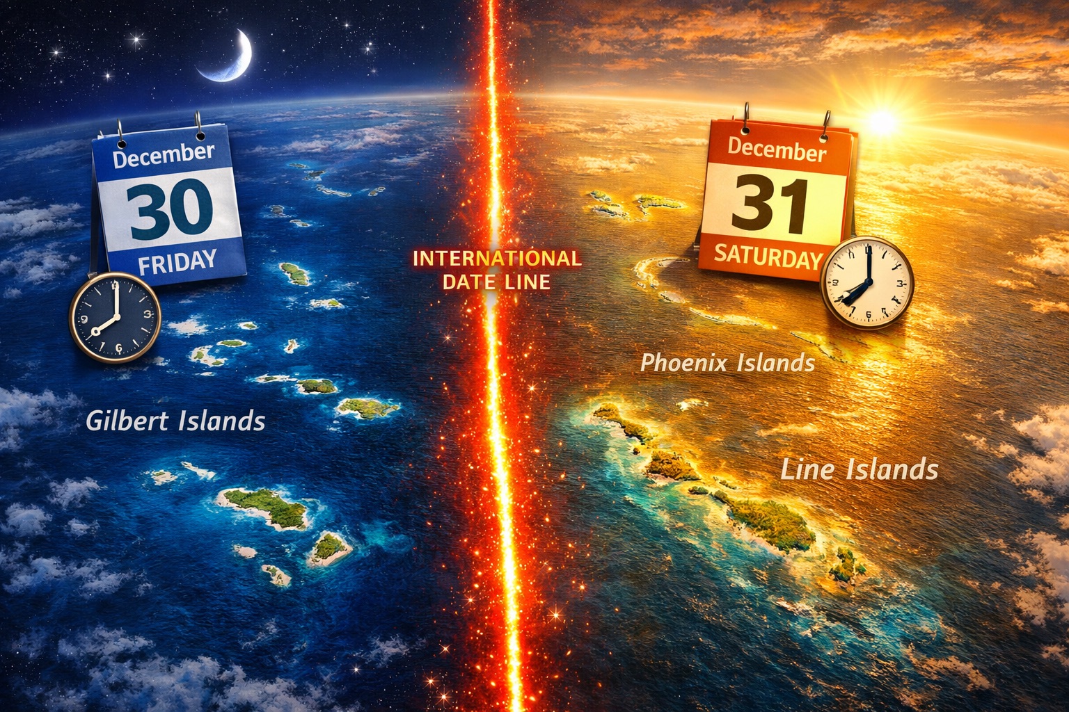 日付変更線は太平洋を縦断する境界線であり、これを越えると日付が一日進んだり戻ったりする。キリバスはこの線の真上に位置していたため、同じ国内でありながら西側のギルバート諸島と東側のフェニックス諸島・ライン諸島とでは、最大23時間もの時差が生じていた。つまり、国内のある地域では金曜日なのに、別の地域では土曜日という状況が常態化していたのである。