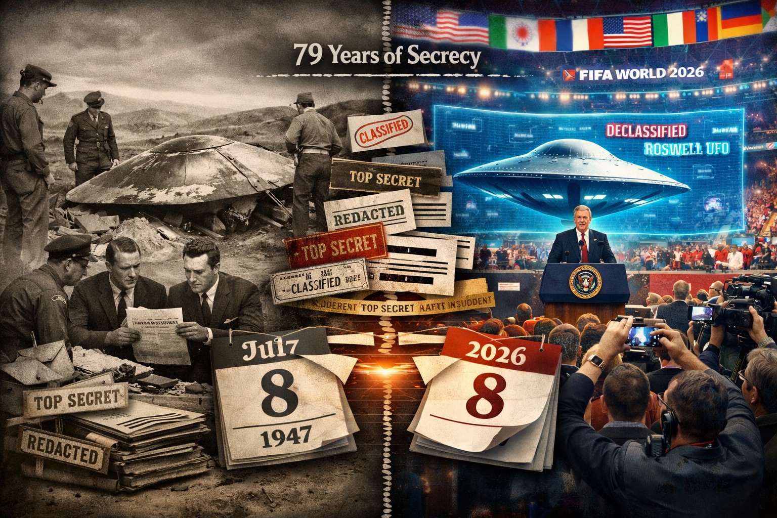 リー氏は、世界中の注目がアメリカ開催のFIFAワールドカップに注目が集まる2026年7月8日に、トランプ大統領が国民に向けて演説を行うという。その日は79年前にニューメキシコ州ロズウェルでUFOが墜落したとされる「ロズウェル事件」の後、米軍が「空飛ぶ円盤」を回収したと公式発表した日だ。