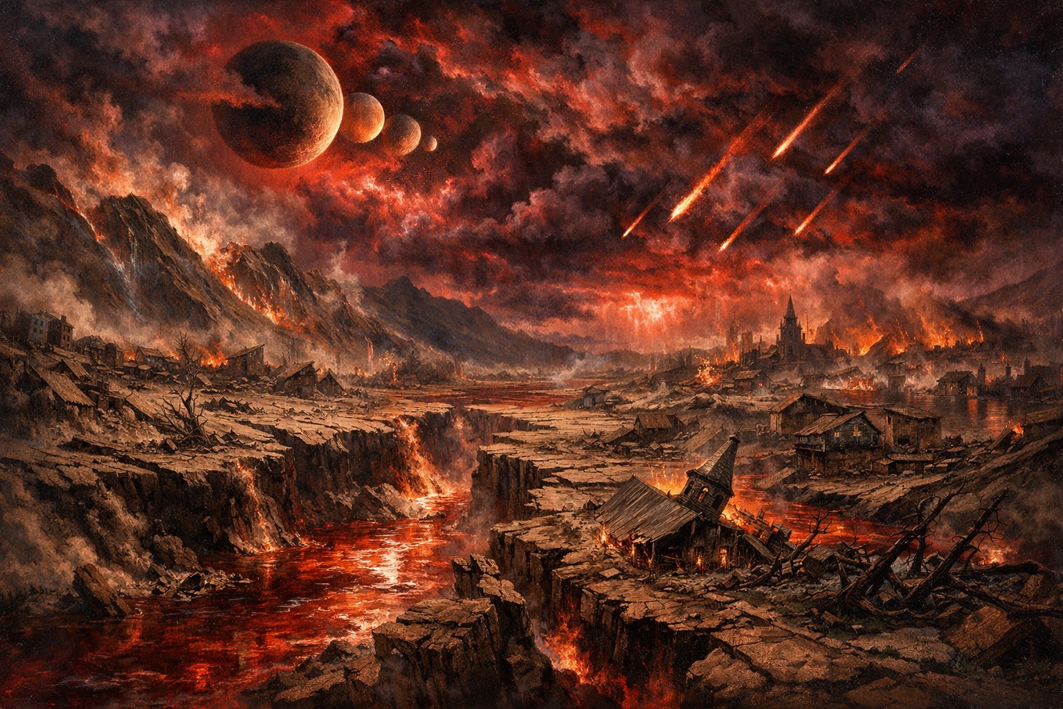 突然、激しい地震が起こり、人間、木々、山々、海、すべてが揺さぶられる。瞬く間に大地はひっくり返り、血の川が水の川のように流れるだろう