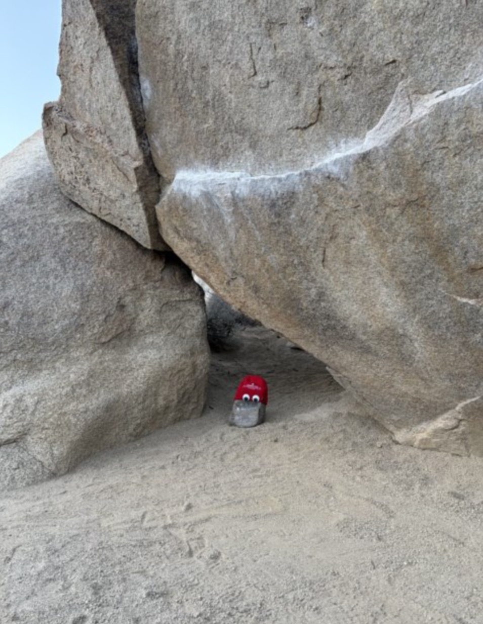 半信半疑で現場に向かったサルボ氏が目にしたのは、変わり果てた(?)姿のポータブルだった。なんと、その石には「動く目玉(ギョロ目)」が貼り付けられ、カナダ国旗をあしらったニット帽を被らされていたのだ。