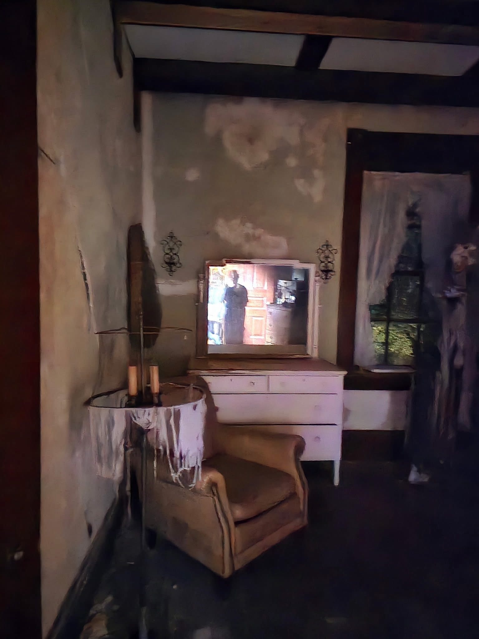 その後、彼女は「使用人の寝室」へと足を運んだ。そこで何気なく、年代物の鏡が付いたドレッサーを撮影したのだが……。後で写真を確認した彼女は、自分の目を疑うことになる。鏡の中に、自分とは似ても似つかない黒い人影がはっきりと写り込んでいたのだ。