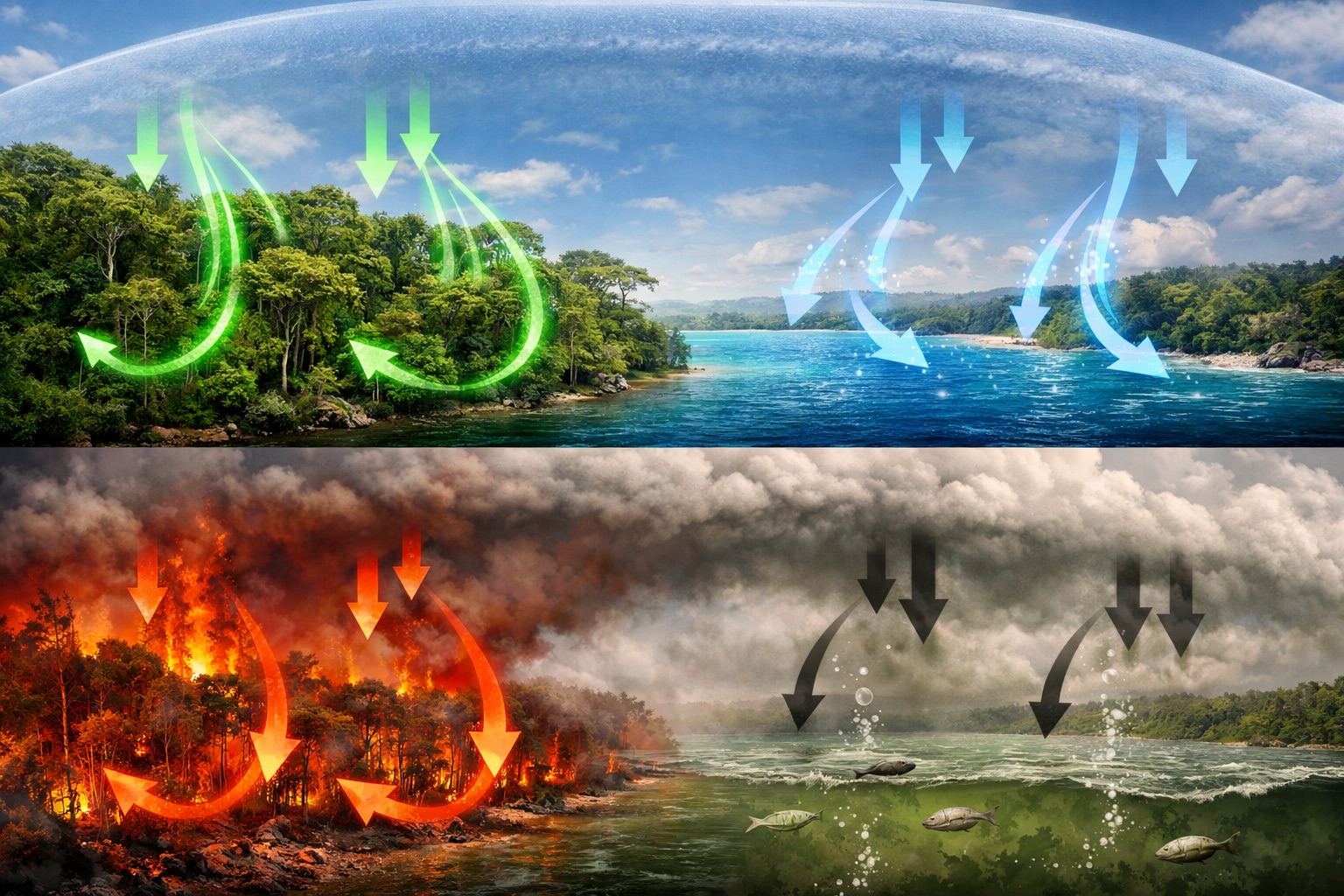 たとえば、グリーンランド氷床の融解は大西洋の海流を弱め、アマゾンの降雨量を減少させる可能性がある。
