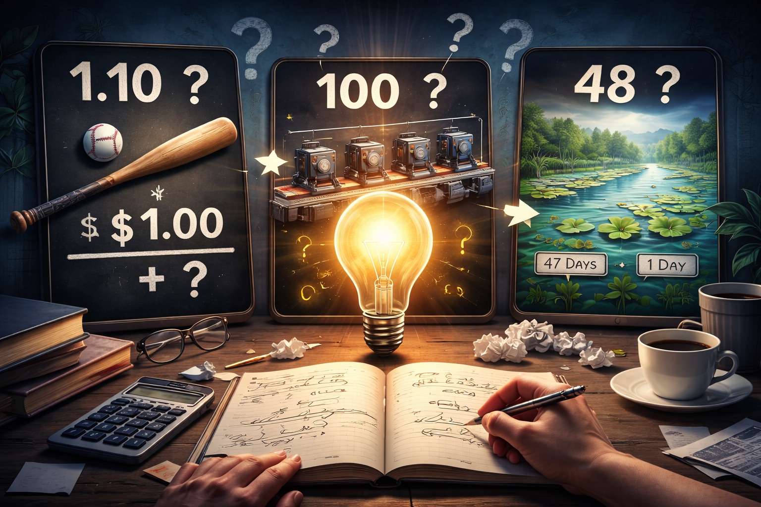 もしボールが0.10ドルなら、バットはそれより1.00ドル高い1.10ドルになり、合計は1.20ドルになってしまう。正解は「0.05ドル(5セント)」だ。ボールが0.05ドルなら、バットは1.05ドル。これなら差額はちょうど1.00ドルになり、合計も1.10ドルに収まるというわけだ。