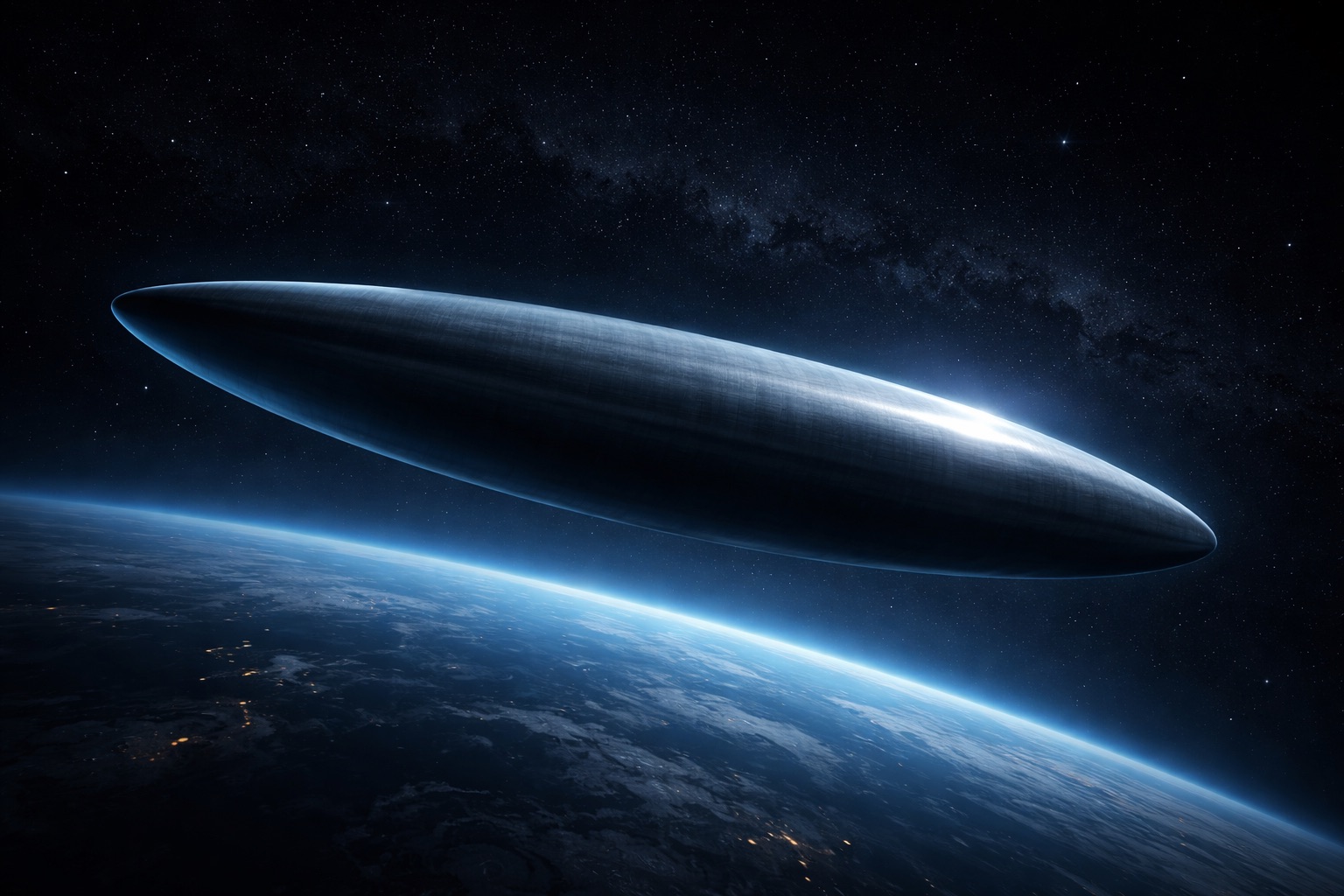 地球の上空に浮かぶ「銀色の葉巻」