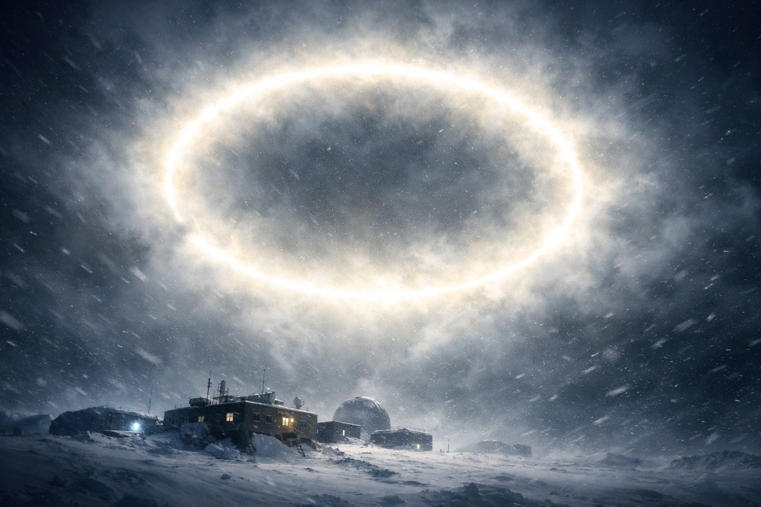 吹雪の中、基地の外に出た隊員が、頭上を通過する「巨大な光の輪」を目撃したのだ。雲に覆われていたため光はぼやけていたが、その物体は巨大で、音もなくゆっくりと海の方へ移動していったという。