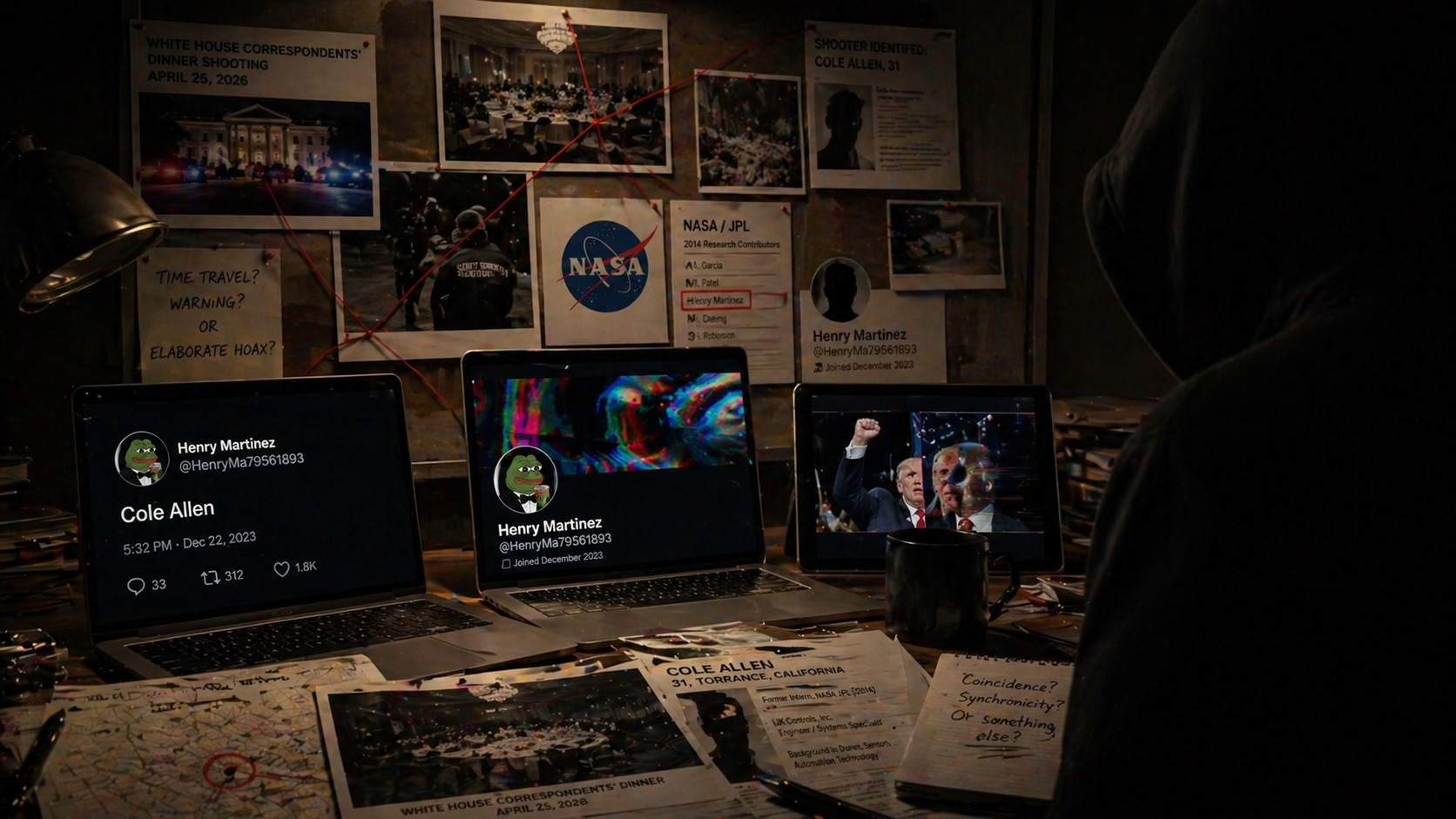 ・容疑者本人の自作自演(PSYOP)説:コール・アレン本人が、2014年のNASAの同僚(Henry Martinez)の名前を騙って偽アカウントを作り、自らのテロ行為を「神話化」するためにあらかじめ“予言”を仕込んでいたという説。彼にはドローンやセンサー技術(IJK Controls社など)の高度な知識があったため、ネット上の工作も容易だったのかもしれない。